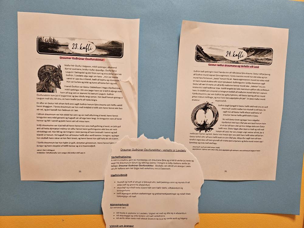 6. bekkur les Laxdælu í nesti og vinnur skapandi verkefni um drauma Guðrúnar ÓsvífursdótturNemendur í 6. bekk hafa undanfarið verið að lesa Laxdælu sögu í nesti og kynnt sér ævintýri og örlög Guðrúnar Ósvífursdóttur. Í tengslum við lesturinn unnu þau fjölbreytt verkefni um drauma Guðrúnar og túlkuðu þá á sinn eigin hátt. Verkefnin vöktu mikla athygli fyrir hugmyndaríkar útfærslur og sýndu nemendur bæði djúpan skilning á sögunni og mikla sköpunargleði. Kennararnir segja að lesturinn á Laxdælu hafi vakið áhuga nemenda á fornbókmenntum og skapað góða umræðu um tilfinningar, örlög og tíðaranda þess tíma.