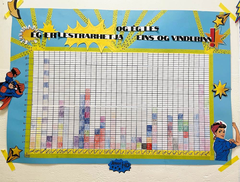 Öflugt lestrarátak hjá 3. bekkFyrir stuttu var 3.bekkur með lestrarátak sem vakti mikla gleði og áhuga meðal nemenda. Markmiðið var að efla lestraráhuga og styrkja lesfærni á einstaklingsmiðaðan og skemmtilegan máta. Í bekknum var sett upp stórt plakat með súluriti í ofurhetjuþema. Nafn hvers nemanda var merkt neðst á súluritinu og í hvert sinn sem nemandi lauk við bók, lituðu þau inn í súluna sína og þannig hækkaði hún smám saman eftir því sem fleiri bækur voru lesnar. Til viðbótar við súluritið átti hver einn nemandi sína eigin ofurhetju sem styrktist með hverri lesinni bók. Eftir að bók var kláruð, merktu nemendur við hjá ofurhetjunni sinni og völdu nýjan ofurkraft til að gera ofurhetjuna sína öflugri. Lestrarátakið hefur verið frábær leið til að efla lestrarfærni, samvinnu og gleði í bekknum og ,,lestar ofurhetjurnar" okkar eru svo sannarlega orðnar fimari í lestrinum!
